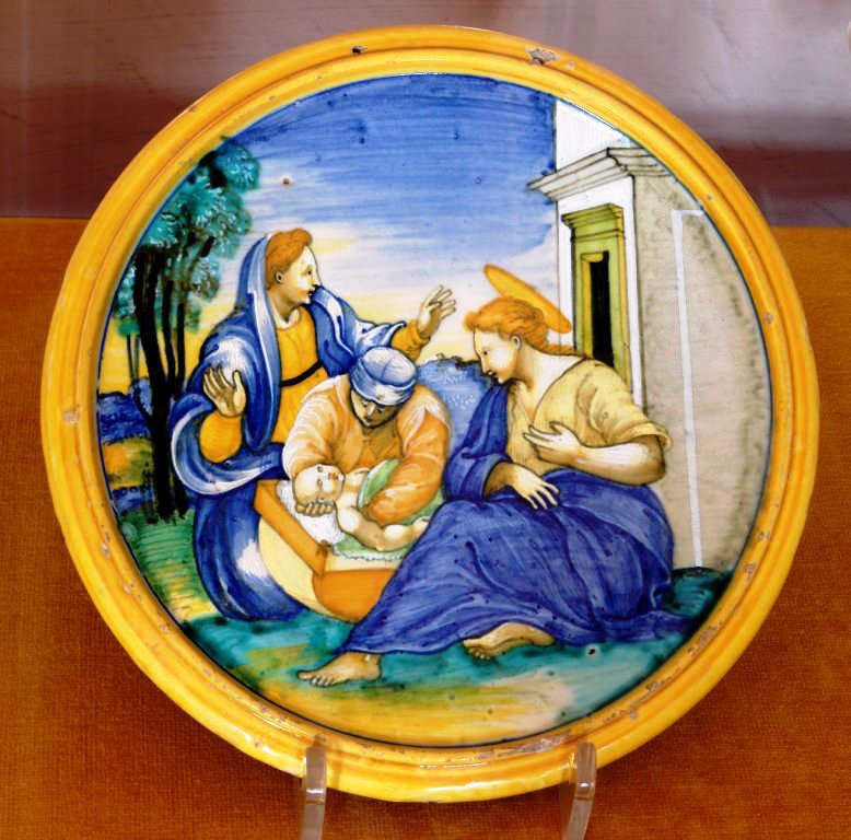 È dovuto a uno dei più importanti ceramisti del Cinquecento il pregiatissimo servizio in maiolica a destinazione aristocratica, istoriato con la Natività di Gesù e composto da una scodella e da un coperchio che rovesciato serviva da piattino, nel quale era usanza disporre le vivande per la puerpera, una tradizione che rimanda ai significati e alla simbologia degli oggetti legati alla nascita (Scarica la scheda di approfondimento >>).